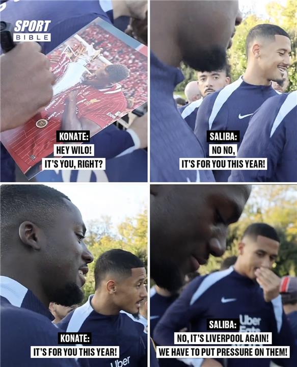شوهد نجم ليفربول إبراهيما كوناتي يسخر مازحاً من أحد لاعبي آرسنال بشأن سباق لقب الدوري الإنجليزي الممتاز هذا الموسم.